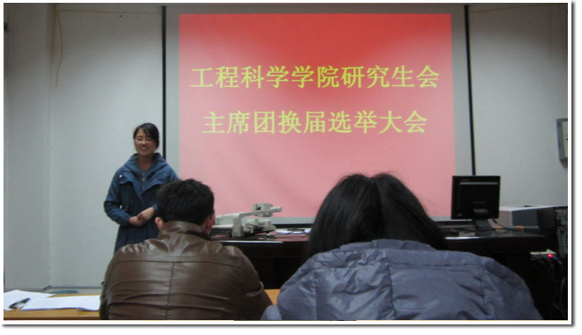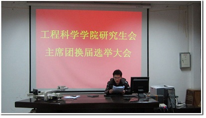 2012年2月24日18点,在力学二楼215室举行了2011-2012学年工程科学学院研究生会主席团换届选举大会。工程科学学院分团委副书记、前校研究生会副主席、前工院研究生会主席朱伟经,以及我院研会全体人员出席了本次会议。会议由工程科学学院研究生会主席郭琦主持。