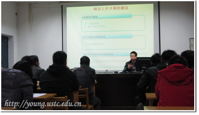 会议首先由毛世鑫同学做工作报告。他就任期内的组织建设以及校级、院级活动进行了汇报,分析缺点和不足,指出当前研会组织建设方面仍存有需要完善的地方,并希望下一届研会能够攻坚克难,继续努力。
