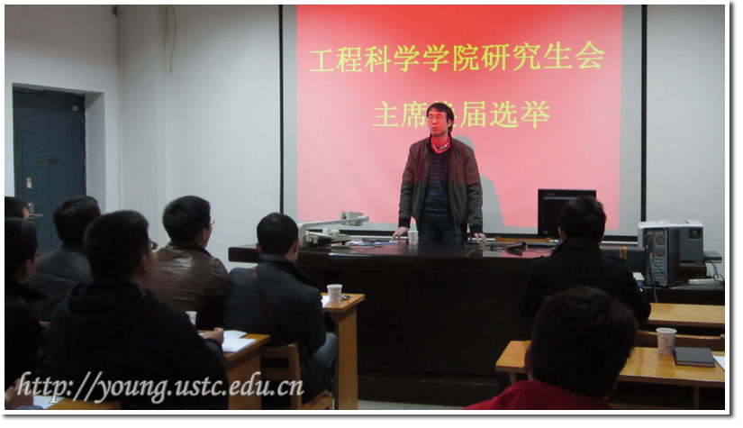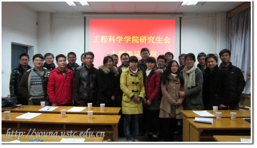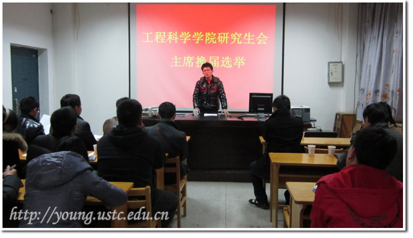 承继往开来,续研会辉煌。2012年2月21日晚上6点,2011-2012学年工程科学学院研究生会主席换届选举大会在力学二楼215室成功举行。工程科学学院分团委书记骆念武老师,前校研究生会副主席、前工院研究生会主席朱伟经,校研究生会副主席刘少辰,校研究生会综合办公室主任屈直,西区各兄弟院系研究生会主席以及我院研会全体人员出席了本次会议。会议由王庆博同学主持。