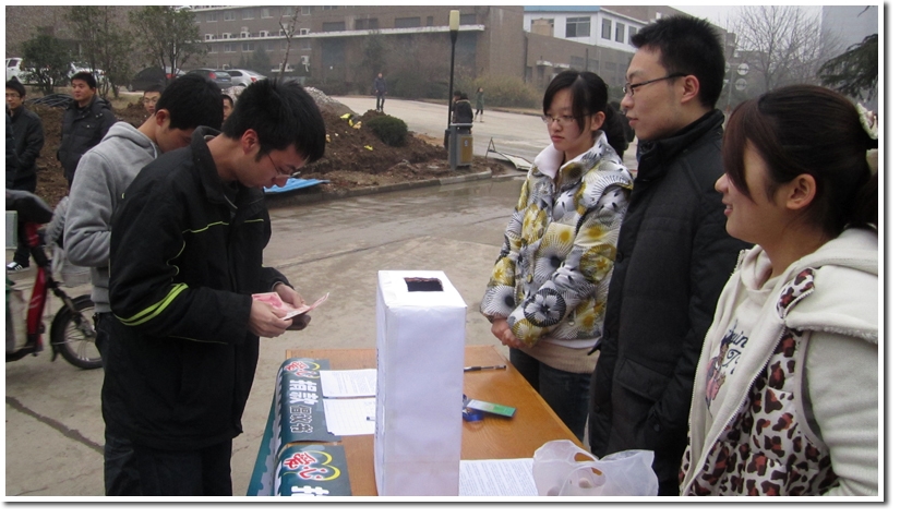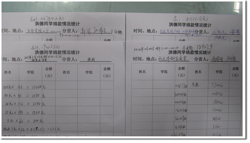 23日和24日的中午和晚上,我们分别在西区的生物楼大厅、研究生食堂、本科生食堂、以及东区学生活动中心广场设立了募捐箱,并由研究生会成员、学生会成员、以及其班级同学一同负责。全校师生 积极响应,慷慨解囊,甚至有很多合肥的市民以及武警官兵特意赶来生院大厅为洪德同学的家庭献出一份爱心,令现场工作人员十分感动。更有众多毕业校友以及海外校友纷纷通过网上转账的方式进行募捐。