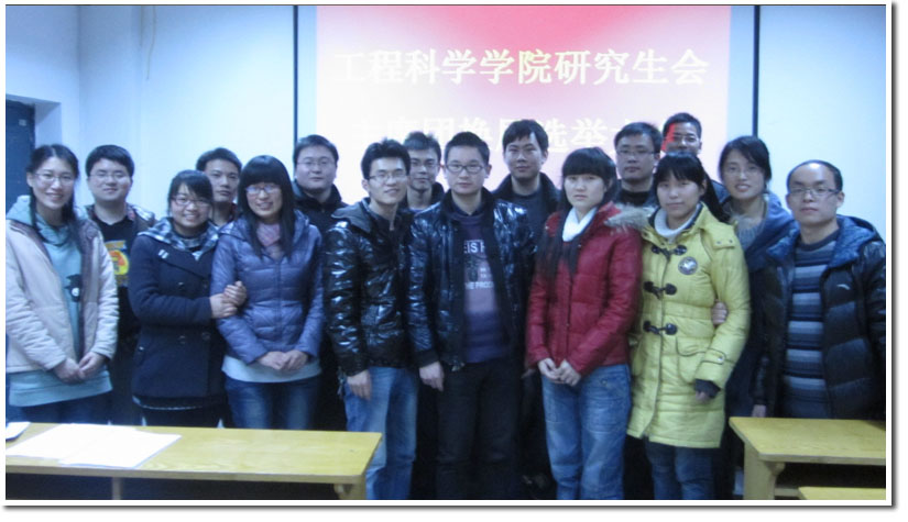2012年2月24日18点,在力学二楼215室举行了2011-2012学年工程科学学院研究生会主席团换届选举大会。工程科学学院分团委副书记、前校研究生会副主席、前工院研究生会主席朱伟经,以及我院研会全体人员出席了本次会议。会议由工程科学学院研究生会主席郭琦主持。
