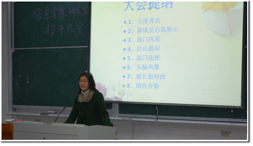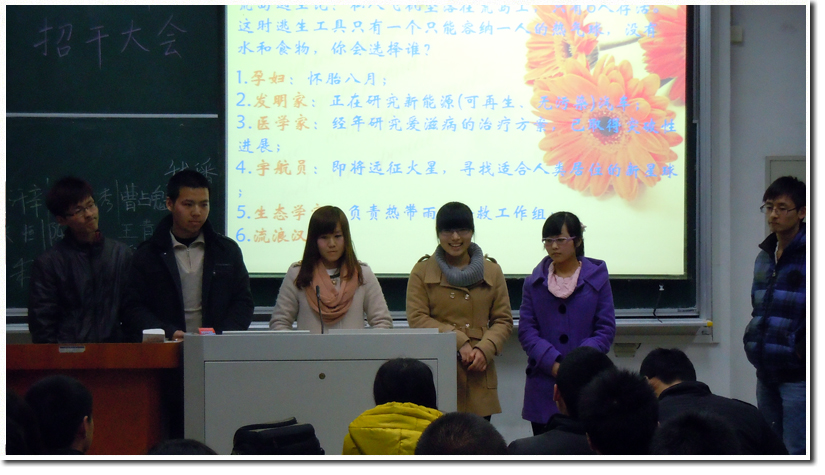 了解了研究生会的概况后,部员们进行了自我介绍,大家发言十分积极,很踊跃的想让大家认识自己。