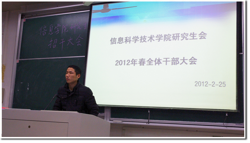招新活动结束之后,2月25日,信息学院研究生会2012年秋季学期全体干部大会在3121教室隆重召开,有50余位研究生会成员参加了本次大会。此次大会主要的目的一方面是让新成员了解研究生会,并尽快融入研究生会当中,另一方面也是为了增强组织凝聚力,为本学期活动的开展打下良好的基础。会议一开始主席刘海波介绍了研究生会概况。
