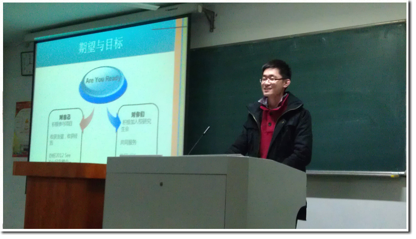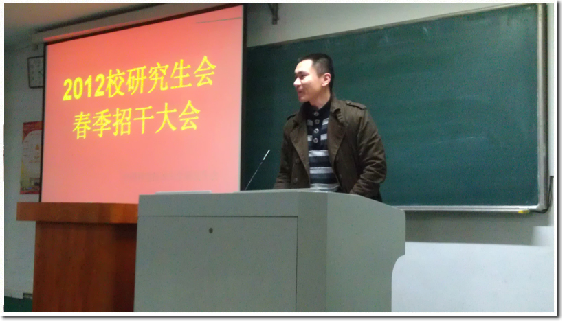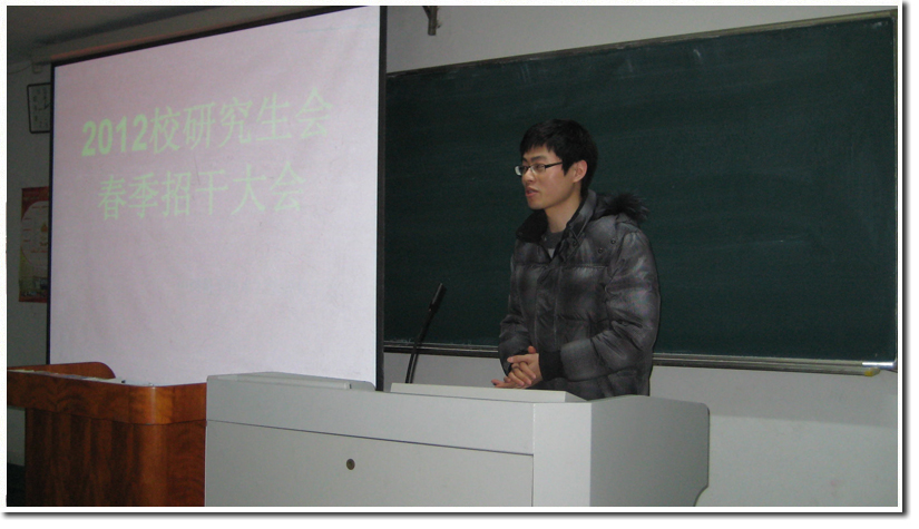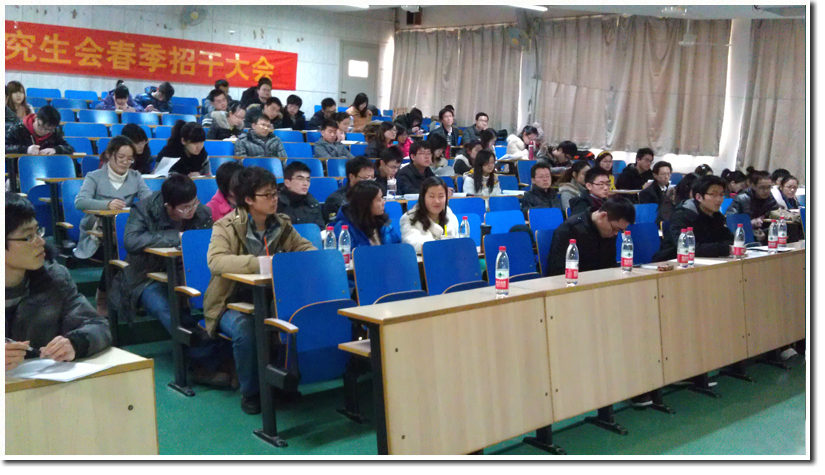 招干大会开始,同学们欣赏了一段精美的视频,对校研究生会有了一个初步的了解并感受到校研究生会的魅力。校研究生会主席贺承浩向同学们讲述了自己在研会三年多的时间里对研会的感触,希望同学们能好好规划研究生三年的时光,并对他们提出了要求与期望。