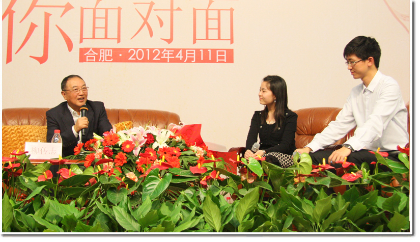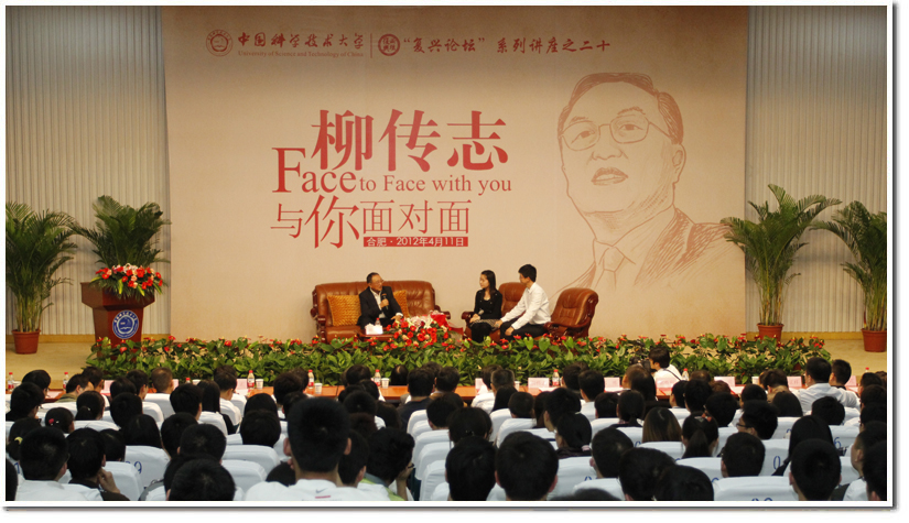 2012年4月11日晚,在东区理化大楼东三报告厅,联想集团创始人、联想控股董事长、中国著名企业家柳传志先生做客本期复兴论坛,与现场近八百名师生分享奋斗经历与创业体会,畅谈智慧人生。校党委副书记鹿明等领导出席了本次活动。联想控股及子公司的嘉宾朋友、中国科大的部分校友也来到了活动现场,近千名感兴趣师生通过网络直播观看了访谈。
