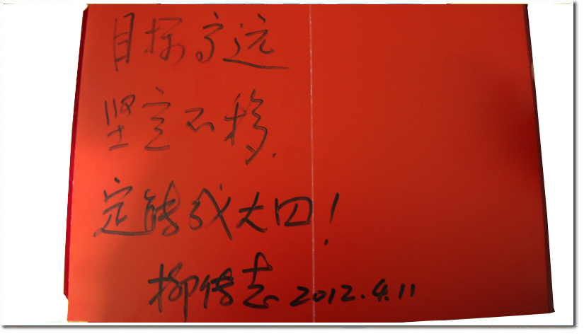 最后柳传志先生在现场为科大学子亲笔题词:写下了“目标高远、坚定不移、定能成大器”的励志箴言。