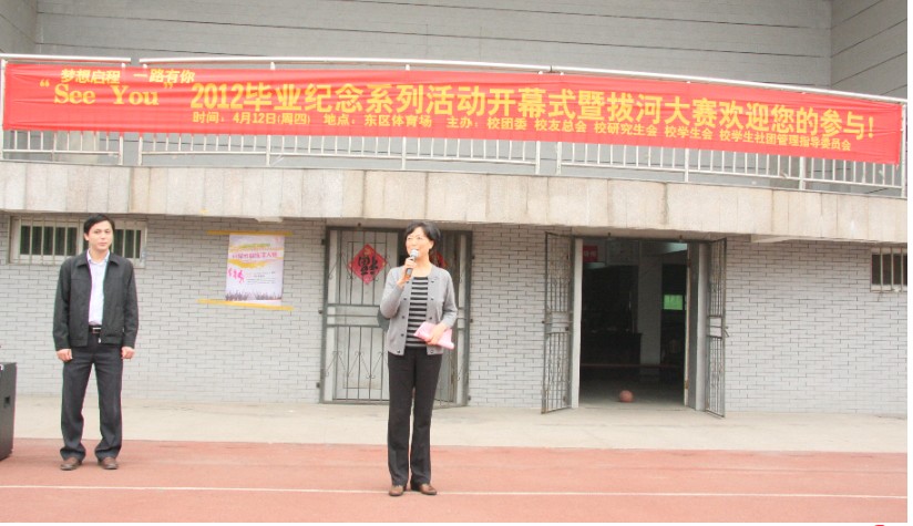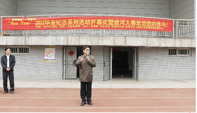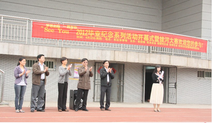许武老师郑重宣布“See You”2012毕业纪念系列活动正式开幕。鹿明老师为开幕式致辞,并预祝活动圆满成功。鹿老师对拔河大赛“凝心聚力,团结拼搏”的意义给予了充分肯定,并寄语毕业生,以毕业为新的起点,离开母校后继续在新的人生道路上勇于探索,追寻理想。