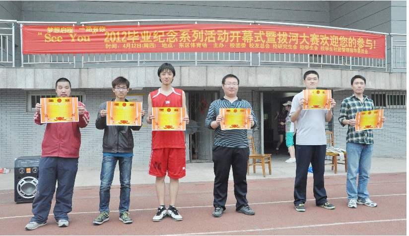 4月12日下午,“See You”2012毕业纪念系列活动开幕式暨拔河大赛在我校东区体育场火热举行。活动得到了各级校领导的大力支持,校党委书记许武老师、校党委副书记鹿明老师、校团委和校友总会的各位领导和老师出席了本次活动。此外,有逾400名2012届毕业生和2011级代培研究生共同参加了本次开幕式暨拔河大赛活动。