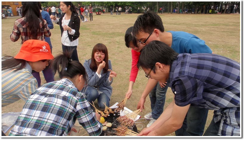 10点不到,同学们就到达了烧烤区,热火朝天的烧烤活动就此拉开帷幕。同学们分成三组,纷纷围着烤炉,不论男女都纷纷拿出自己的看家本事,大家忙的不亦乐乎,一边交流各自的经验,一边分享着自己的美味美食。