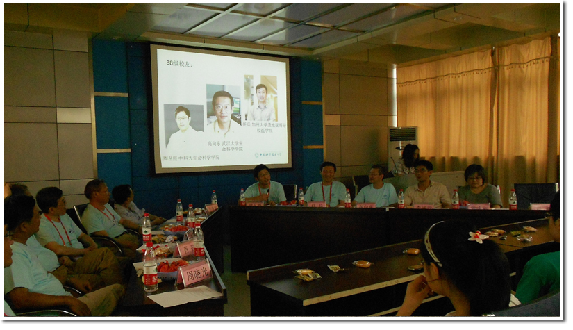 首先,主持人开场,简单介绍返校校友。到场的77级校友包括:中科院北京半导体研究所的周晓光、复旦大学生命科学学院的石建、中科院上海生命科学信息中心的陈成材、中科院成都生物研究所的肖亮、中科院上海药物研究所的万锋、中科大生命科学学院的吴继辉;87级校友包括:加州大学圣地亚哥分校医学院的任兵、武汉大学生命科学学院的高向东、中科大生命科学学院的周丛照、 上海德勤管理咨询公司的李涵君、北京东方广视科技股份有限公司的郭咏梅。