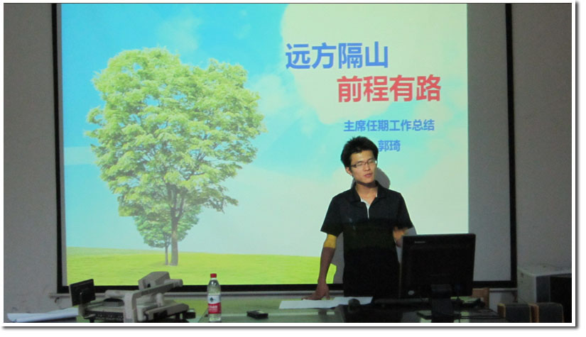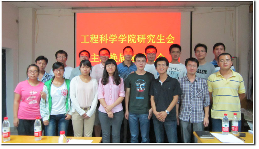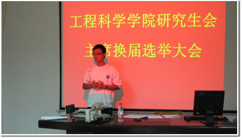 远方隔山,前程有路。2012年9月17日19:00点,2012-2013学年工程科学学院研究生会主席换届选举大会在力学二楼215多媒体教室成功举行。校研究生会副主席张弢,校研究生会文艺体育部部长徐宁,各兄弟院系研究生会主席以及我院研究生会全体人员出席了本次会议。会议由前任主席郭琦同学主持。
