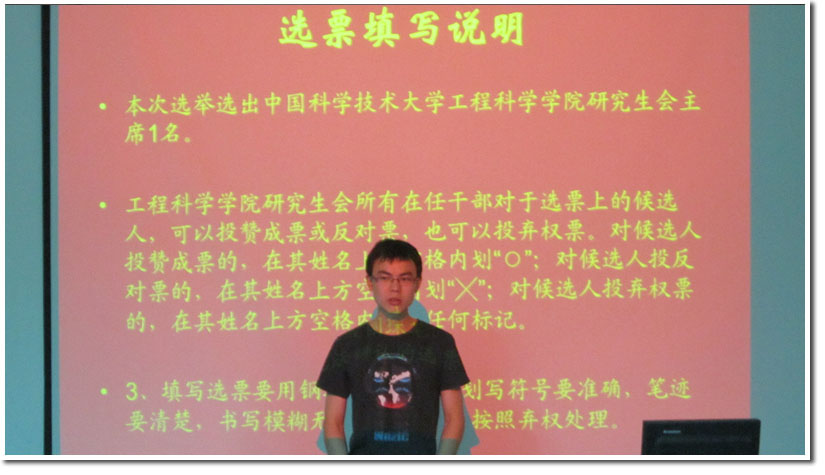 在随后的议程中,大会严格按照工程科学学院研究生会主席选举办法进行了新一届主席的选举。候选人朱云龙同学以全票当选工程科学学院研究生会新一届主席。