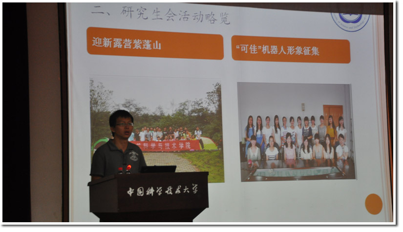 最后院研究生会主席潘玉彪向新同学介绍了院研究生会的结构框架、各部门的职能、历史与成绩以及对未来的规划,并希望有志于服务同学的研究生新生能够加入院研究生会这个集体。