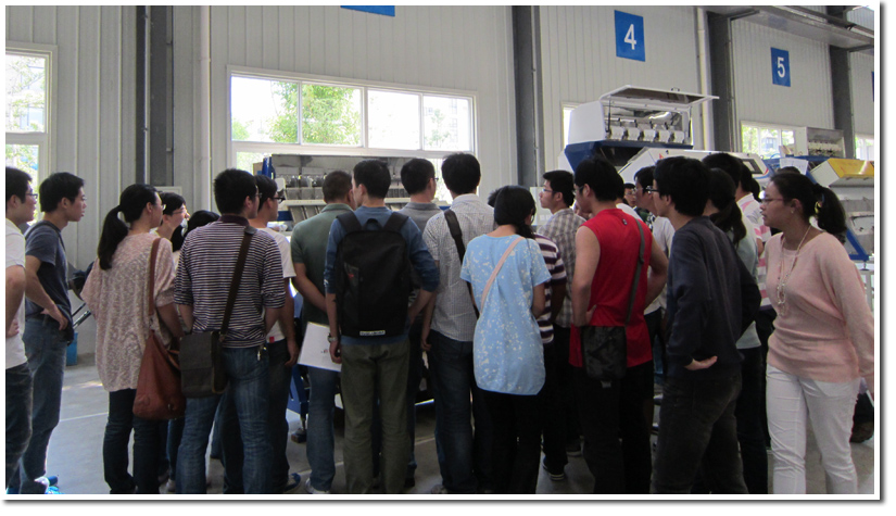在工作人员的带领下,同学们走进生产车间,观看生产流程。在这里,各式各样的色选机激发了同学们的好奇心,纷纷围在技术工程师身旁,一边观看演示,一边对工作原理进行探讨,气氛十分活跃。