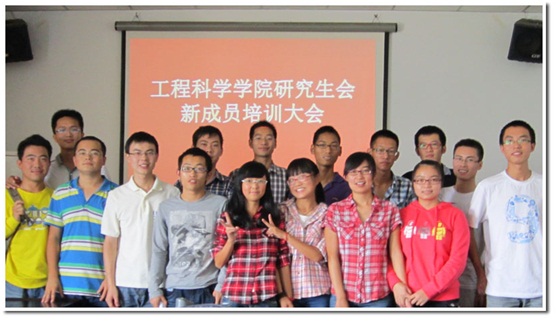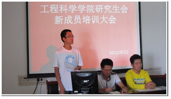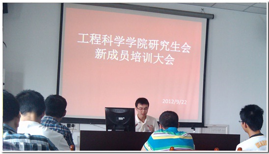 2012年9月22日9时,工程科学学院研究生会在力一楼504多媒体教室举行了2012年秋季新成员培训大会,工程科学学院研究生会主席朱云龙参加并主持了本次培训会议。