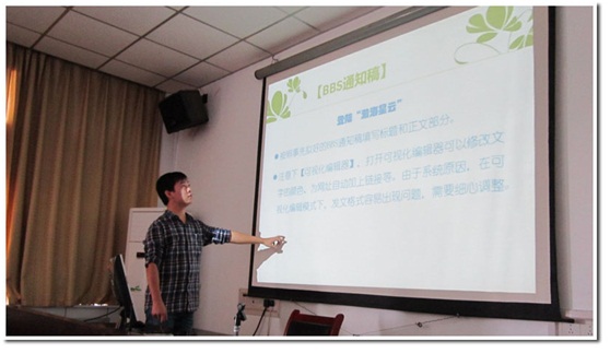 此次秋季招新,为我们的组织注入了新鲜血液,保证了我们组织的延续性。为了使新干部尽快熟悉相关活动的流程和相关操作,此次会议以完成《中国科学技术大学团学活动项目实施计划书》的书写为切入点,结合广大老干部的活动经验开展,对新干部进行理论和实践双向培训。副主席邸越对新闻稿设计进行了理论阐述和经验总结、王浩对校内BBS操作及发稿作了经验交流。