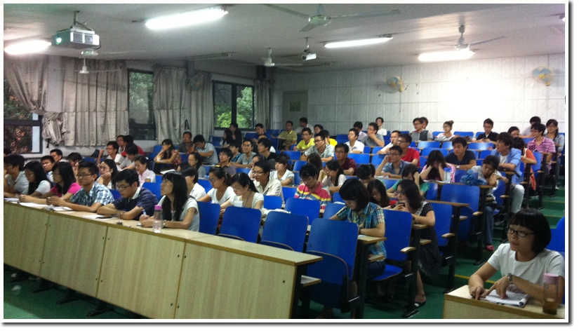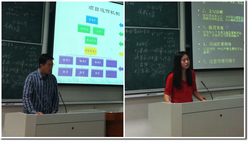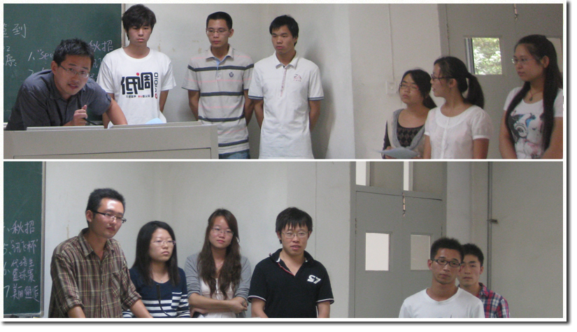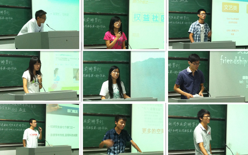 2012年9月8日上午,在东区2106教室,校研究生会副主席杨树介绍了校研究生会组织建设和规章制度,展示了校研究生会主办的品牌活动并与大家分享自己的经验和感悟。随后,项目负责人王蓓简要地介绍了本次招干活动,包括培训流程、考核评分机制和注意事项等。随后主持人公布了招干培训分组名单,各组组长分别由校研究生会各部门部长担任。会后,之前未报名的同学们积极参与现场补报名。同时,同学们与到场老干部进行了互动交流,进一步加深了对校研究生会的了解。