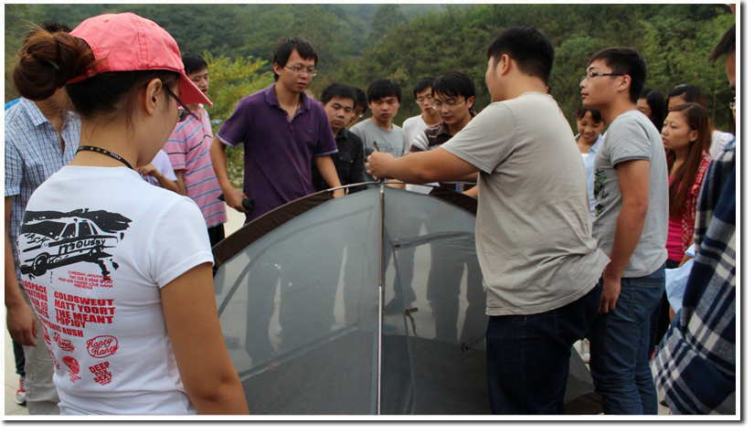 接着,同学们在组长的演示下,围成一圈,细心地听着组长的讲解,认真地学习搭帐篷、收帐篷的细节。稍后,同学们两两搭起了帐篷,大家相互帮助,顺利地完成帐篷的搭建过程。