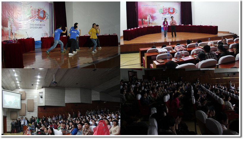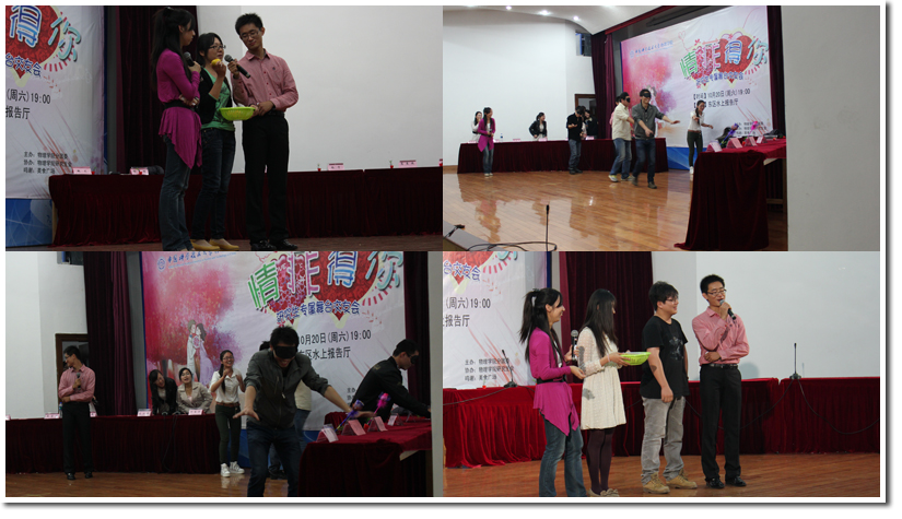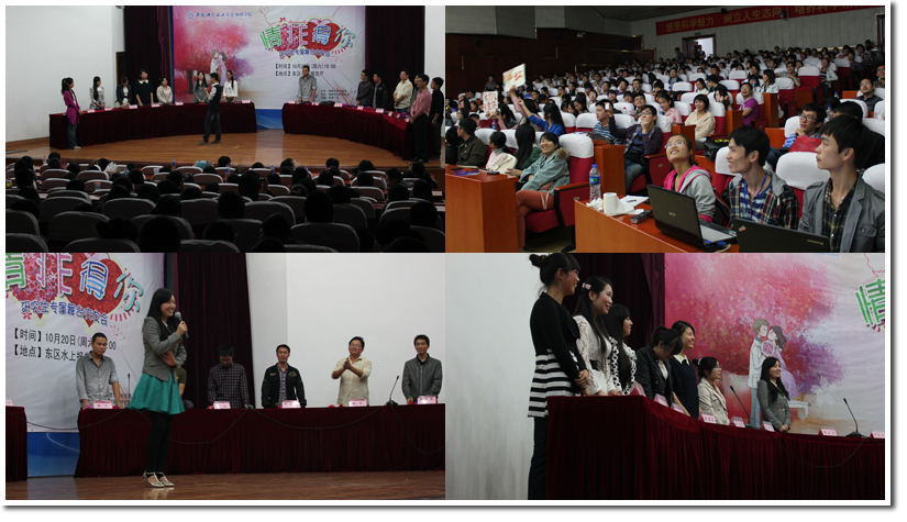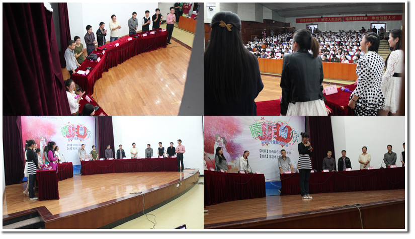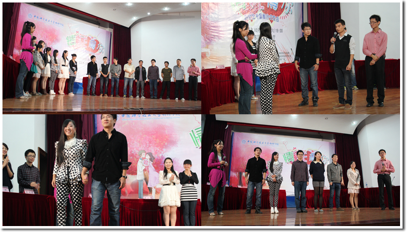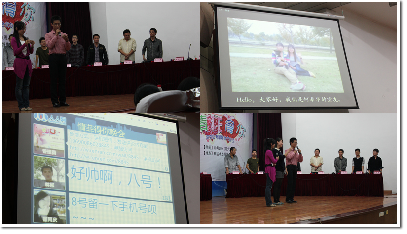 19:00开始,水上报告厅就被热情的亲友团和观众挤满,随着开场舞《江南Style》的结束,“情菲得你”正式拉开帷幕。主持人带领观众进入到活动第一个环节---“一见倾心”,男女嘉宾依次登场并表明了自己的心迹,嘉宾们精彩的VCR给观众们留下了深刻的印象,大家纷纷发送短信至人人留言墙表达自己的心情。第一个环节结束,嘉宾们都对彼此有了初步的认识。