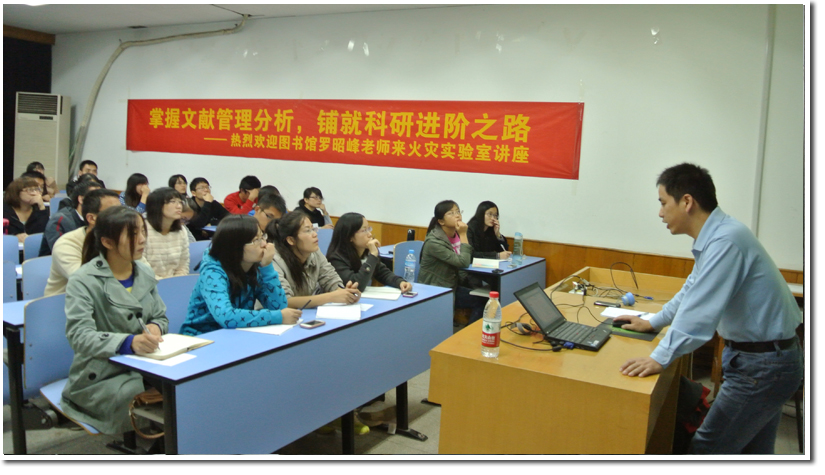 2012年11月02日晚,由火灾实验室研究生会举办,罗昭峰老师主讲的的关于《EndNote软件使用与文件检索》的讲座在西校区力一楼三楼多媒体教室圆满举行。火灾实验室团总支书记祝玉泉和研会主席丁超出