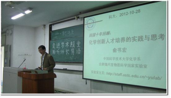 10月28日下午,由化学院分团委主办、化学院研究生会承办的“学术论坛”系列活动之“走进学术殿堂,聆听师长隽语”报告会在东区2106教室成功举办。此次活动的嘉宾为长江特聘教授、国家杰出青年基金获得者、教授、博士生导师俞书宏老师和三位在科研方面崭露头角的优秀学长冉瑾、葛进、贺晨。