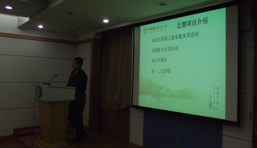 在主持人宣布大会开始,介绍了此次会议的主要内容后,实验室研究生会副主席王云龙介绍了近期将要开展的项目,并确定了各项目负责人。正在进行的一二九合唱活动负责人傅丽碧同学对活动当前遇到的问题征求了大家的意见,祁鑫鑫同学动员大家积极报名参加巾帼杯,组建实验室女子足球队。