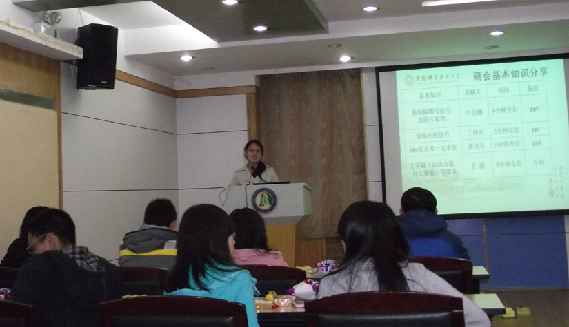 接着是研会基本知识分享环节。叶佳娜、丁怀对、董肖肖等同学结合近期已开展的活动,对照片的处理、新闻稿的编写和上传等内容进行详细讲解。之后,研会主席丁超指出研会日常工作中出现的错误,认为细节决定成败,态度决定高度。通过这一环节,研究生会干部对研会工作有了进一步的认识,同时提高了基本技能。