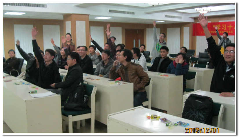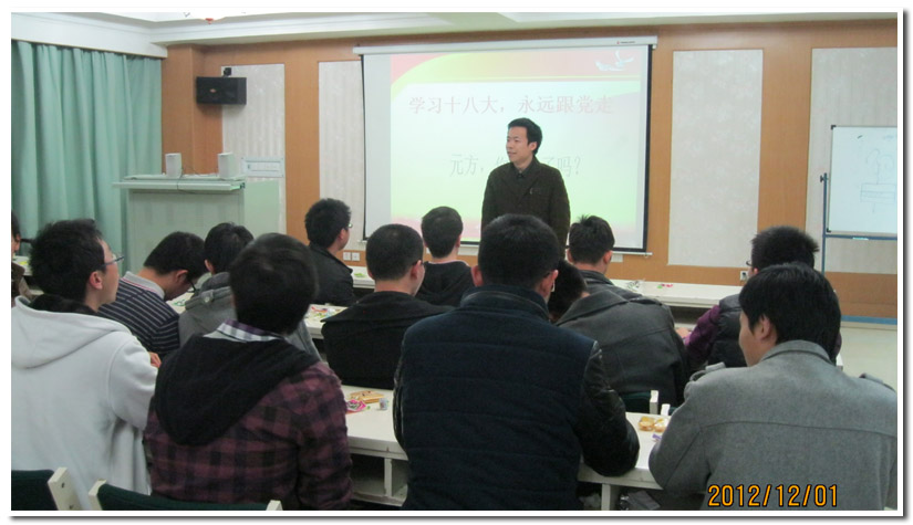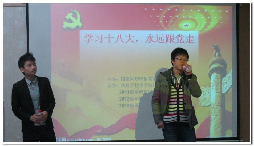 12月1日晚7点30分,由国家同步辐射实验室团总支主办,核科学技术学院研究生会承办的 “学习十八大,永远跟党走”学习交流活动在国家同步辐射实验室3号楼210会议室成功举办。国家同步辐射实验室团委副书记李玉全出席本次活动,参加本次学习活动的还有核学院2011级硕博班以及2012级硕博1,2班的全体同学。