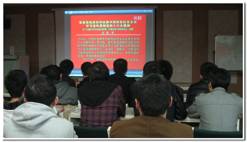 随后,同学们观看了一段精心准备的视频。这段视频带领大家回顾了中国共产党从成立到带领中国人民当家作主再到实现国家富强的曲折光辉的历程和十七大以来所取得的伟大成就,以及习近平主席在十八大上的重要讲话,他指出在建党100周年之际实现全面小康,在建国100周年之际实现中等发达水平的奋斗目标。