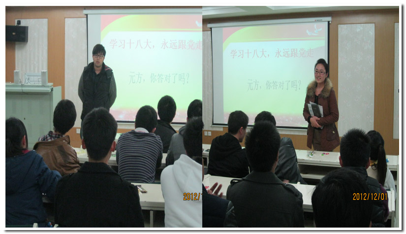 视频播放结束后,活动进入到有奖知识问答环节。主持人根据刚刚播放的视频,提出相关问题,包括党史、党的政策,十八大精神以及一些国内国际时事等等。同学们纷纷踊跃抢答,场面十分热烈。每位获得答题机会并回答正确的同学都将获得精美的礼品一份,同时根据每个支部同学回答正确题目的数量评选出本次活动的“优秀团支部”。