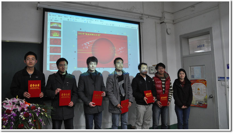阳思老师宣读了对第十三届“挑战杯”全国大学生课外学术科技作品竞赛校内选拔赛优秀作品的表彰决定。倪瑞老师、万洪英老师、杨晓果老师、阳思老师分别为获得特、一、二、三等奖的选手代表颁奖。