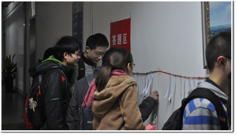 与此同时,在第二教学楼大厅,来往的同学们也都被活动所吸引,他们有些为自己支持的作品投票,有些在有奖问答环节区积极答题获得奖品,还有些在留言墙上写下感想和祝福。