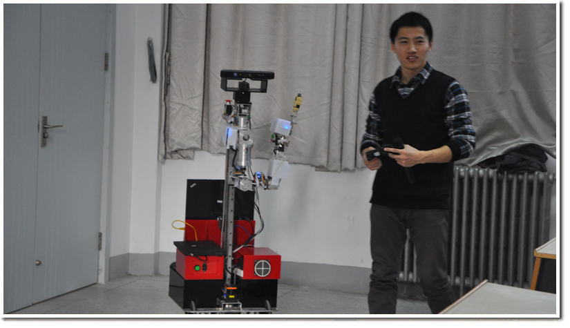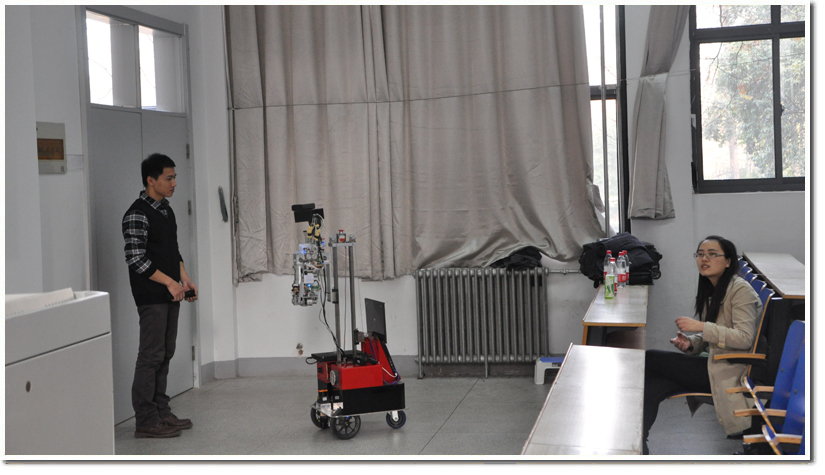 上午9:00,在2121教室,已熟悉环境并完成调试的“可佳”机器人开始现场表演超市购物、餐厅服务等功能。参展人员首先通过话筒向机器人发出命令,“可佳”就能不受任何外界干扰的顺利完成任务。实验人员随后又依次向“可佳”发出了多个命令,“可佳”都能一一自主完成,引来在场同学的赞叹与喝彩。