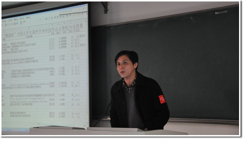 12月7日下午,第十三届“挑战杯”全国大学生课外学生科技作品竞赛校内赛决赛评审会在东区第二教学楼举行。校团委书记杨正老师、校团委副书记杨晓果老师及各学科的权威评审老师出席了会议。会议由校团委副书记杨晓果老师主持。