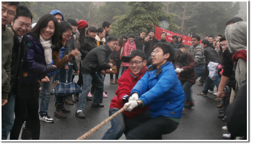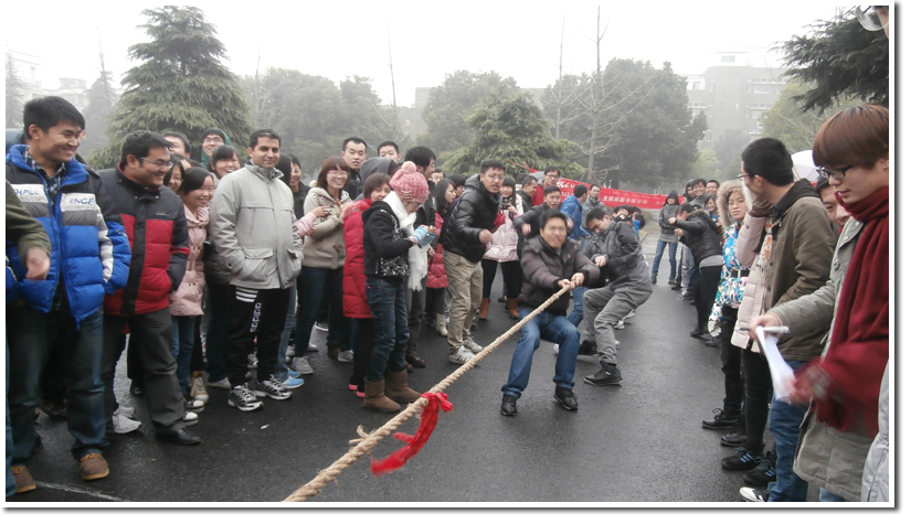 参赛的各支队伍都饱含激情,信心十足!在响亮的哨声和整齐有力的呐喊声中,拔河比赛拉开了序幕。参赛选手们齐心合力,在啦啦队大声的加油声中为赢得比赛努力拼搏,场面既激烈又温馨。