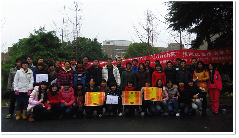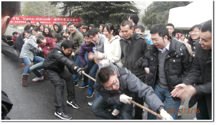 12月16日下午,生命科学学院第二届“Sigma-Aldrich”杯拔河比赛在我校西区图书馆前火热举行。活动受到各实验室同学们的热情支持,经过踊跃报名,共有22支队伍逾200名同学参加了本次拔河比赛活动。