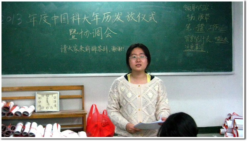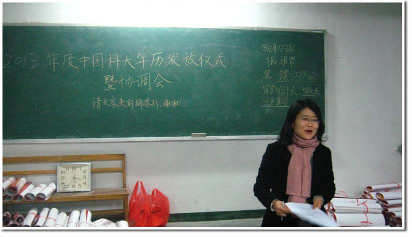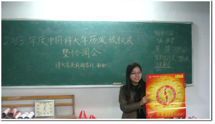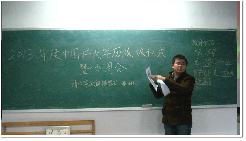 12月19日下午,2013中国科大年历发放仪式暨协调会在东区230一楼教室顺利召开。校团委副书记杨晓果老师、37个学生社团负责人、校研究生会年历项目跟进常委陈宇晴、石宇以及年历项目组同学参加了此次会议。