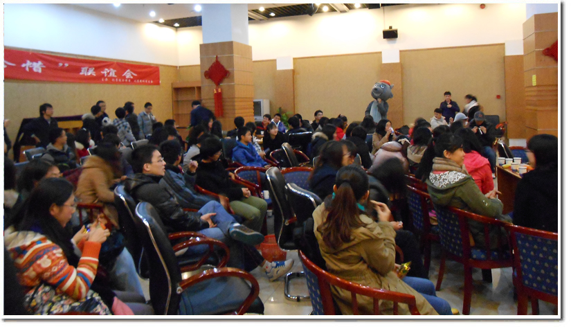 尽管室外是一派肃杀的冬景,活动中心里却洋溢着春日的朝气与夏日的活力。深冬的寒意驱散不了同学们的热情,开场时间不到,就有同学早早的来到了现场。两只造型可爱的灰太狼和红太狼人偶站在多功能厅的门口欢迎同学们的到来,让活动增色不少。同学们很快融入了现场欢腾的气氛。