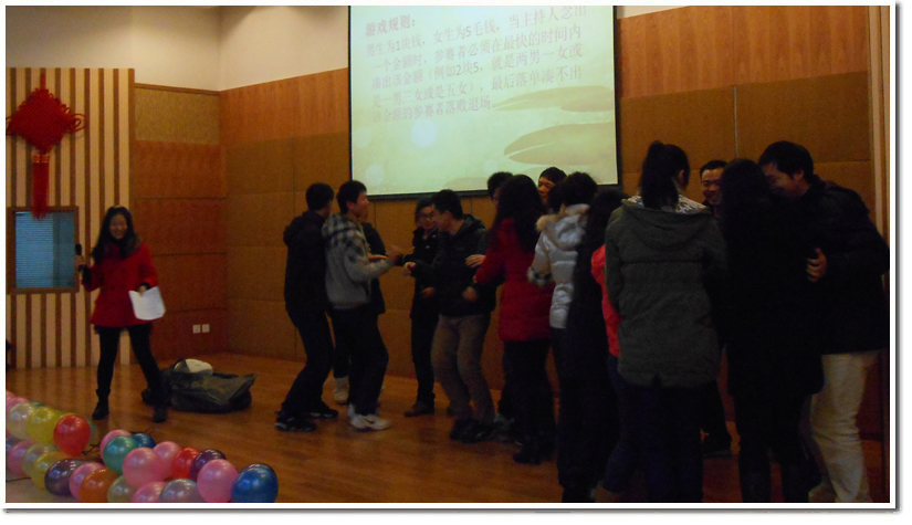 在主持人机灵的气氛调节与带动下,现场气氛十分火爆但又十分有序。同学们积极参与到工作人员精心筹划的游戏中。在不经意间,爱情的种子悄悄播撒,友情的花朵悄然绽放。