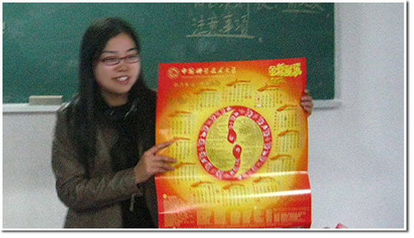 “送年历,迎新年”是我校团学组织的传统品牌活动,自2004年首届举办以来,受到了全校师生、员工的广泛关注和一致好评。在每年的秋冬之末,大家都热切期待着下一年年历的新样式、新内容。2013中国科大个性化年历的创意来源于年历项目组的自身设想以及对外收集。整个年历呈梅花样式,与我们的校徽交相呼应,象征着科大师生自强不息,坚韧不拔的精神。年历上印有2013年预开展的团学品牌活动,所有活动按照举办时间顺序排列,方便同学们进行查找;同时,还印有校内各个单位的联系电话,以及常用的网站网址,方便老师同学们的生活、学习和工作。整张年历以鲜明的红色和黄色为背景色调,金蛇献瑞为背景主题,并融入了浓厚的科大元素于其中,向全校师生展现了积极高昂的奋斗激情和温暖贴心的丝丝祝福。