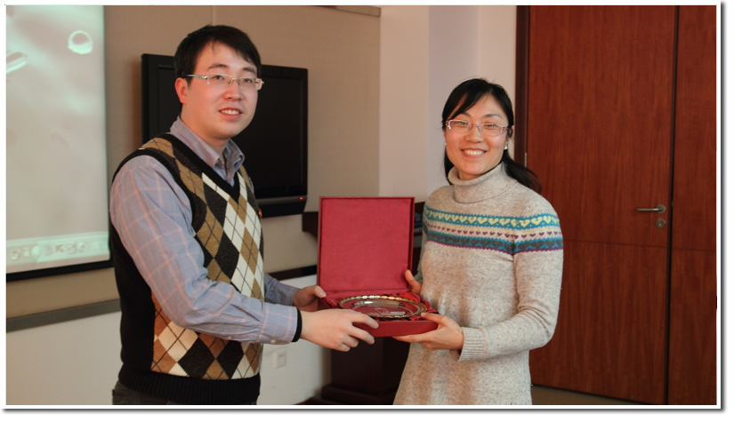 讨论结束后研究生会主席刘少辰向上硅所陆老师赠送了礼物。