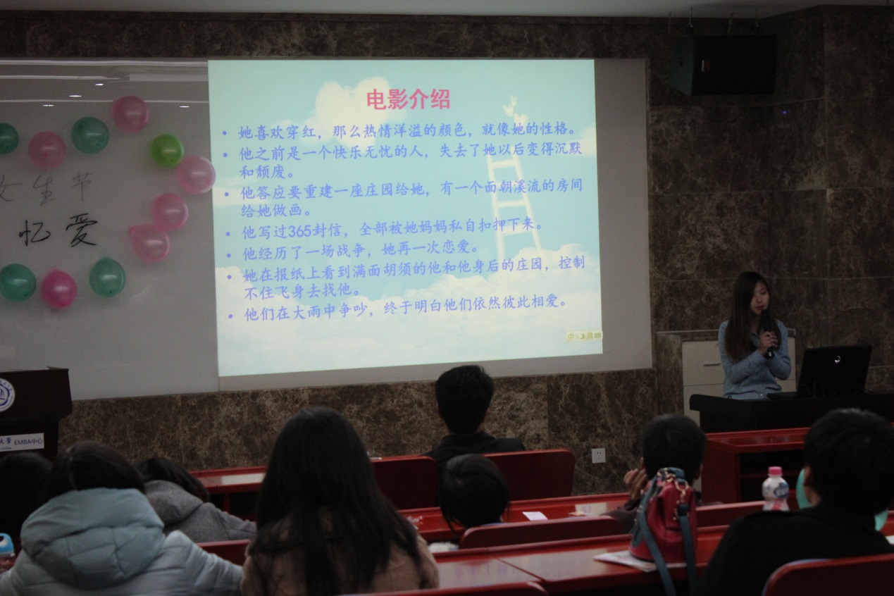 又是一季春花烂漫时,这个专属女生的特别节日如约而至。女生节最可爱的你,这个周末不孤单。3月10日晚六点半,由管理学院研究生会举办的2013“科大魅力”女生节系列活动之管理学院“管理学院•2013•忆爱•电影放映”活动在管理科研楼EMBA中心第四教室甜蜜上映。活动汇集了管理学院各年级的男女生,华丽相聚,现场十分温馨。