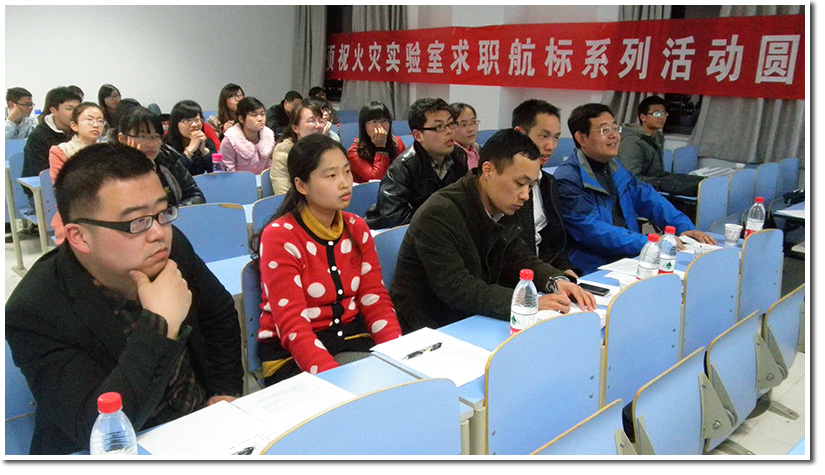 活动邀请了科大立安安全技术股份有限公司人事部郝建国经理,中国电子科技集团公司第38研究所张启兴博士,火灾国家重点实验室团总支书记祝玉泉老师作为面试嘉宾。实验室的学生表现了极高的积极性,坐满了教室,在6:30时,活动正式开始。