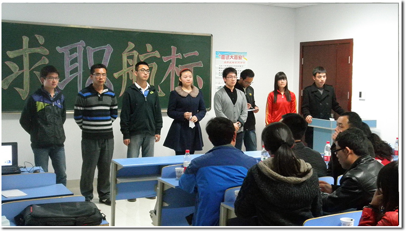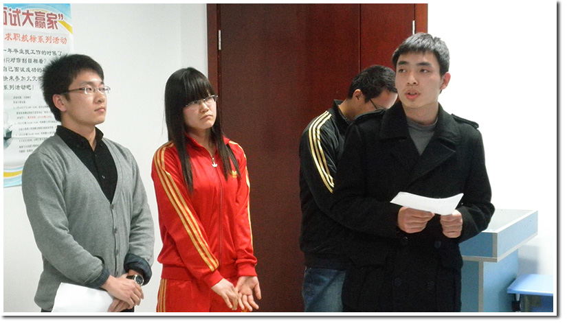 在面试官进行了简单点介绍之后,活动马上进入了精彩的模拟面试环节。第一轮是个人介绍部分,八位面试者各自做了风格不同的自我介绍。有重点介绍自己参加活动多获得奖项多的,也有介绍自己性格方面乐观,做事比较踏实认真的。