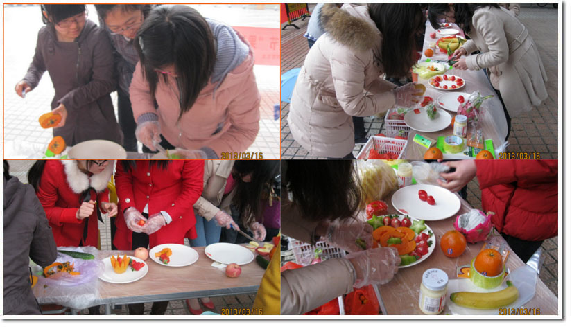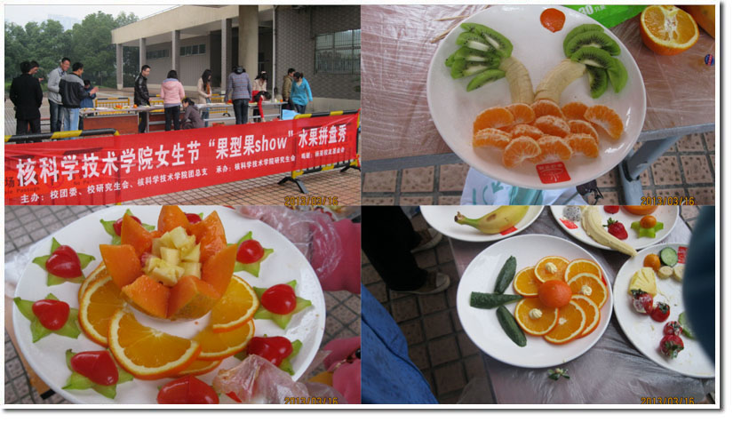 为了丰富同学们课余生活,活跃校园气氛,体现大学生朝气蓬勃,积极向上的精神状态,培养同学们的创新思维。3月16日周六上午,核科学技术学院研究生会在西区活动中心广场上举行女生节“果型果show”水果拼盘秀的活动。
