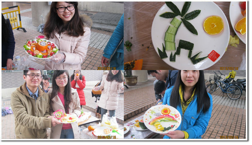 做完了水果拼盘,和自己的创意合影之后,就可以开吃了。本着不浪费的精神,所有水果被同学们一扫而光。活动在欢声笑语中结束。通过这次活动,不仅锻炼了同学们的动手能力,也让同学们在春暖花开的时节,品尝到了各式各样的水果,在工作学习之余享受健康生活。