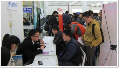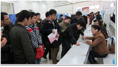 早上8:30,在就业办老师和志愿者同学的指引下,企业代表从江南春宾馆来到西区活动中自己的摊位。现场异常火爆,同学们根据自己的专业方向和求职意向,寻找着自己合适企业单位,向招聘人员递交了简历并详细的咨询了单位的情况,有些单位也组织了现场笔试和面试的环节。