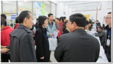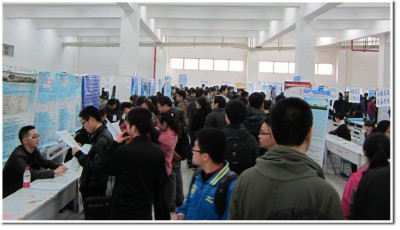 早上8:30,在就业办老师和志愿者同学的指引下,企业代表从江南春宾馆来到西区活动中自己的摊位。现场异常火爆,同学们根据自己的专业方向和求职意向,寻找着自己合适企业单位,向招聘人员递交了简历并详细的咨询了单位的情况,有些单位也组织了现场笔试和面试的环节。