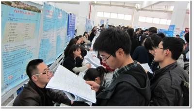 西活一楼招聘会现场,同学在认真的寻找适合自己的单位和专业。