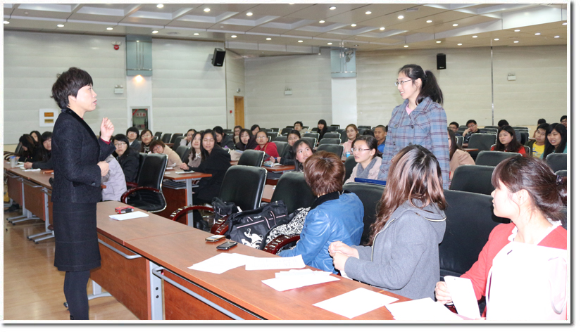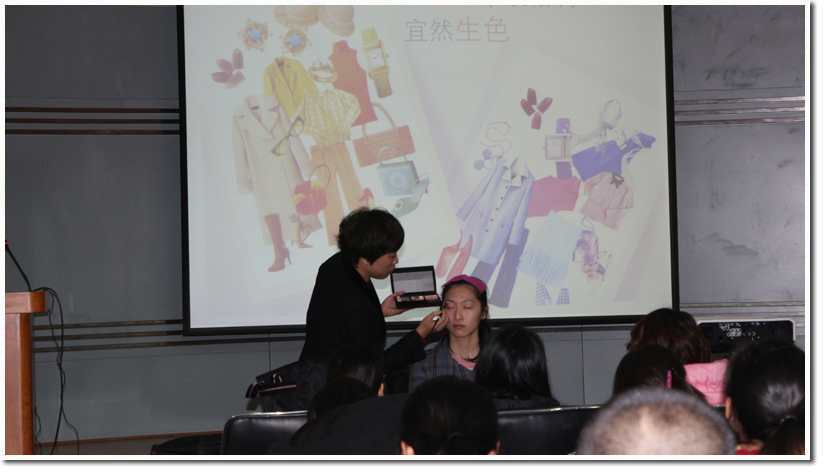 紧接着,尹老师详细的为同学们介绍了服装搭配中的冷暖色调,教同学通过手腕上脉搏的颜色识别自己属于何种色调,这种奇特的识别方式勾起了同学们的浓浓的兴趣。在活动的最后环节到来之前,现场又迎来了第二个高潮,尹老师为同学现场演示彩妆,同学们纷纷举手表示想做彩妆模特。尹老师精心为模特画彩妆,引起台下同学极大的兴趣,大家翘首以待,边欣赏边听尹老师讲解化妆的技巧以及护肤产品的正确使用方法。经过一番精美的装扮,模特可以说判若两人,像极了2012年一部很火的电视剧《北京青年》中的气质美女丁香。